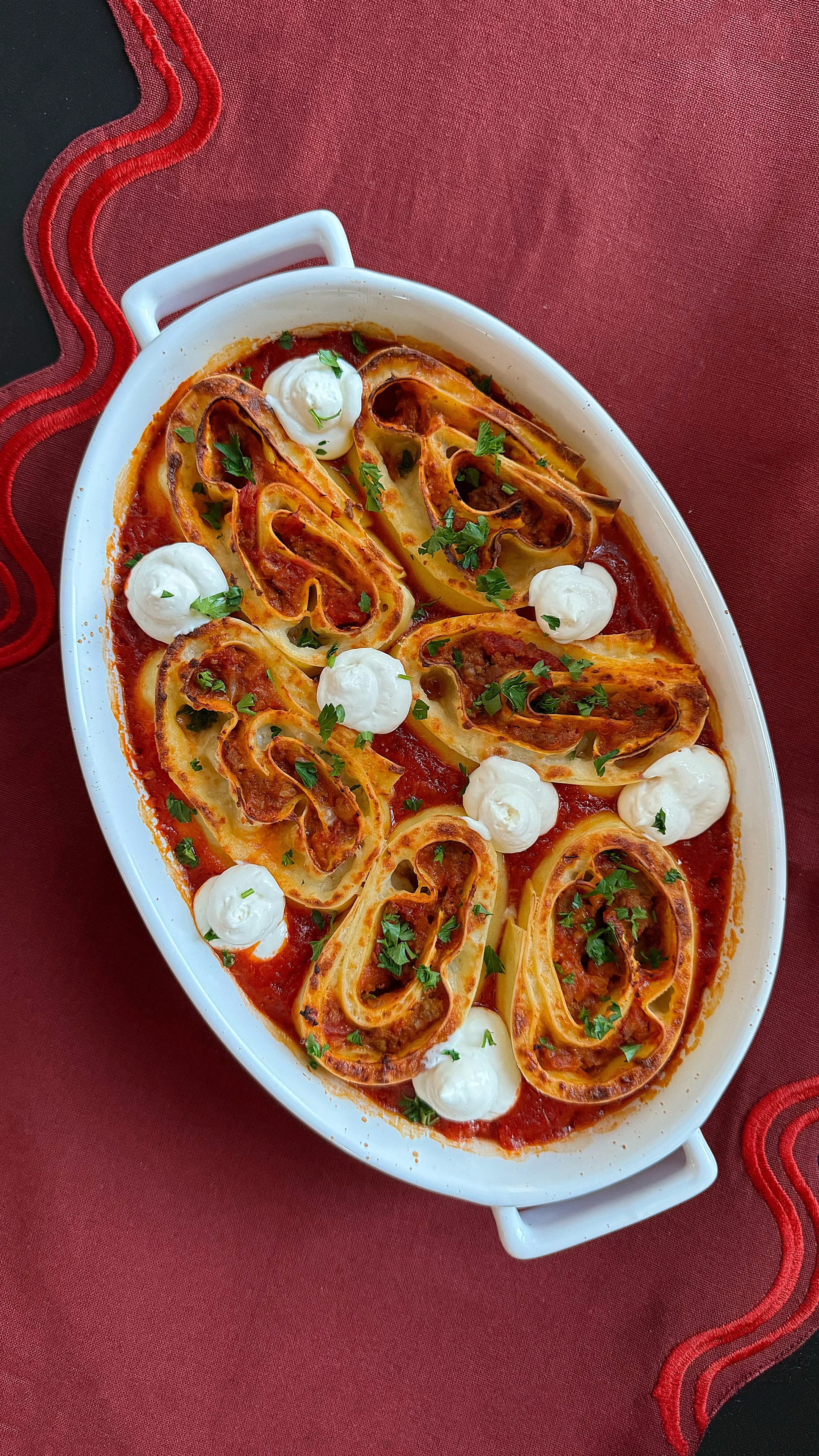 Bake until the pasta edges are golden brown, 20 to 25 minutes. You can also broil for a few minutes at the end if the edges haven’t gotten crispy enough. Remove the baking dish from the oven and add tablespoon-sized dollops of whipped cream cheese between the pinwheels (I used a piping bag) and top with fresh chopped parsley.